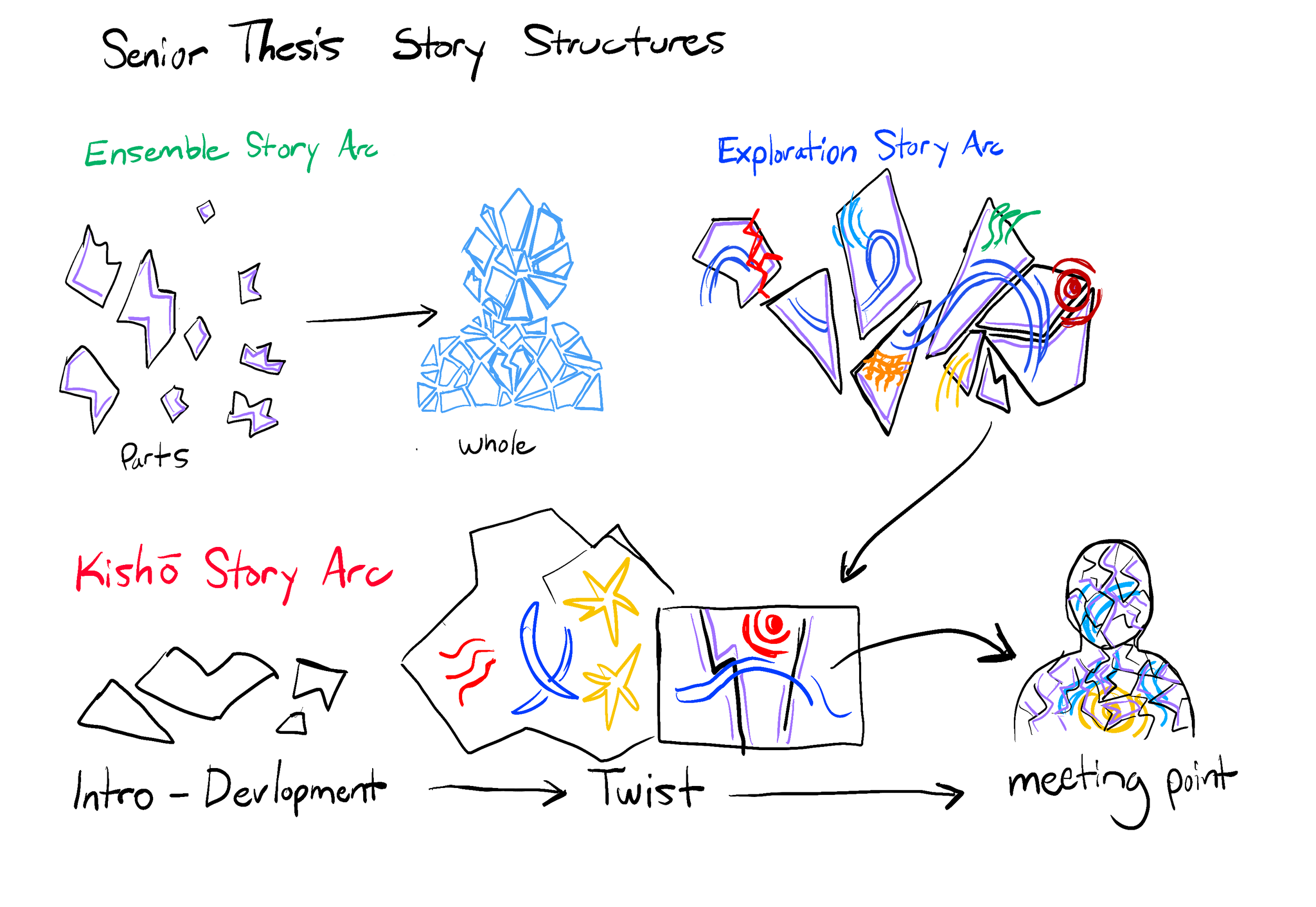 Before the project started, I quickly sketched a rough early explorational story archetype structures for my thesis from an early idea I had in mind.